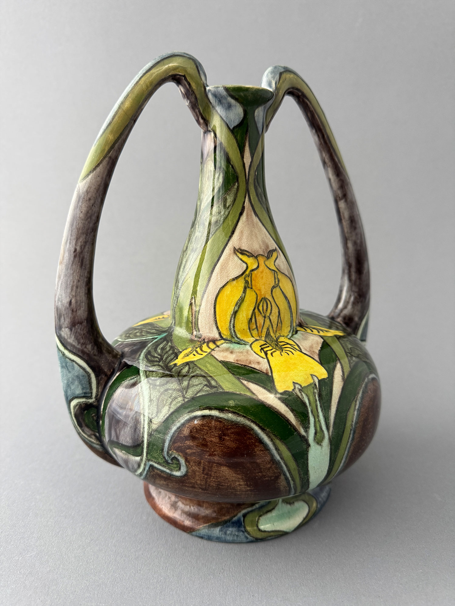 Brantjes Purmerend, vase with ears, model 1082, with tall handles and a yellow iris decoration.