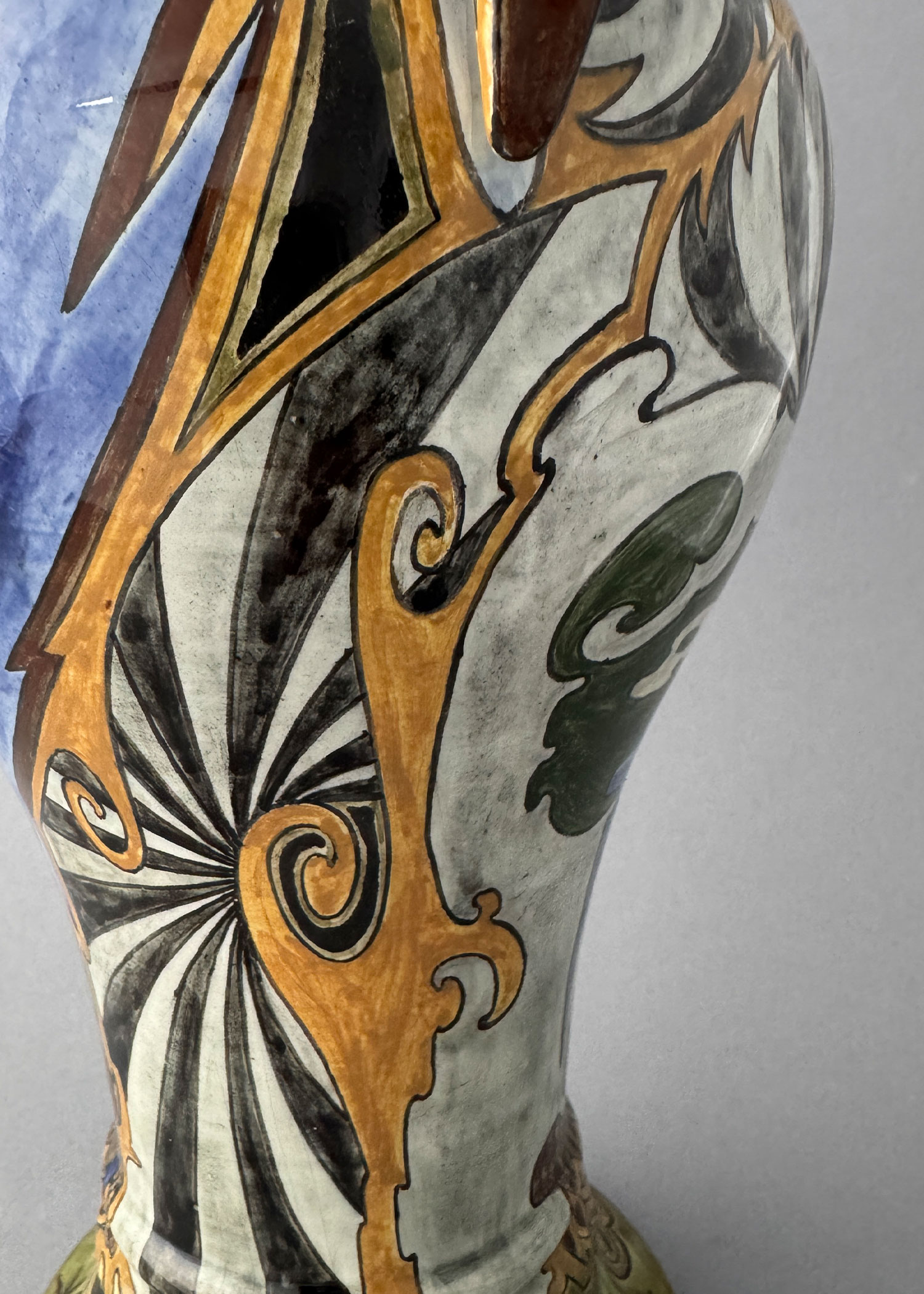 This vase with curved handles and a small lid was made by the Amsterdam pottery factory De Distel. This is model 29 and measures 34 cm (13.3 inch) high and 19 cm (7.5 inch) wide. The vase is beautifully painted with two black crow-like birds in an imaginative landscape full of form and colour. You see black and white areas of colour, which spiral out into blue and green shapes, and an ochre-yellow background. The whole has an almost psychedelic feel! The vase was made between 1895 and 1902. On the bottom, you can see the factory’s name: Distel, and the signature dJB or dB. This could refer to Cornelis de Bruin, but that is not certain. You’ll also see the 29/01, a reference to the model and decor number. Unfortunately, the vase is not dated. On the bottom is also a stamp of the Meentwijck Collection, to which this vase belonged. The covered vase is in great condition. Only a small hairline crack is present under one of the handles, and there’s a tiny chip on the sharp edge of one handle. The decor on this vase clearly illustrates the extensive experimentation with form and colour at Distel in the early years of production, in the quest for more standardized decors. The colour palette is also much lighter and more vibrant than Distel objects from later years, which are mainly dominated by dark blue, green, and brown. In short: a masterpiece from Distel Amsterdam.