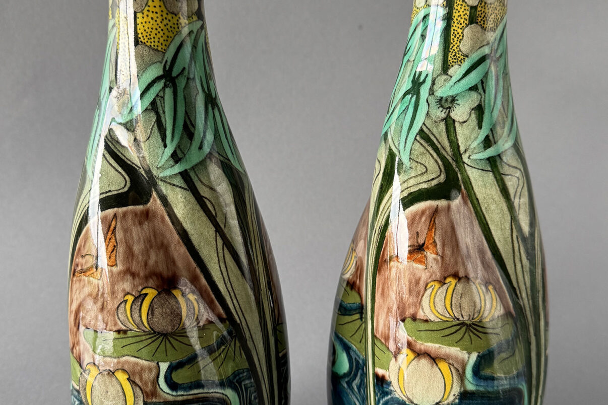 These vases were made by the firm Wed. N.S.A. Brantjes & Co. from Purmerend between 1895 and 1904. They have a very extraordinary wrenched design, which gives the vases a twisted appearance. Three long grooves extend from the neck to the foot, creating a twisted effect. This creates bulges and indentations in the vase’s body. Very beautiful! This pair is design number 1093 and is also depicted in the book “Purmerends Jugendstil Aardewerk 1985-1907” on page 108. Both vases are 31 cm or 12.2 inch high and 10.5 cm or 4.1 inch wide. The vases are decorated with a magnificent motif of butterflies, water lilies, and arrowhead (leaves and flowers) in a colour palette of dark blue, turquoise, yellow, brown, and green. Only one of the vases is signed. The vase is marked on the bottom with the factory name: Faience de Purmerende Hollande. You can see the “NB” and the “little clog” (factory logo) as well as Jacob Vet’s signature: JV. Interestingly, the vase is marked with the incorrect model number: 1040. You can also see a “C” and an “A,” presumably a date and decoration letter. One vase of the set is in pristine condition. The other has had a restoration on the neck in the past, but this is barely visible (see photo).