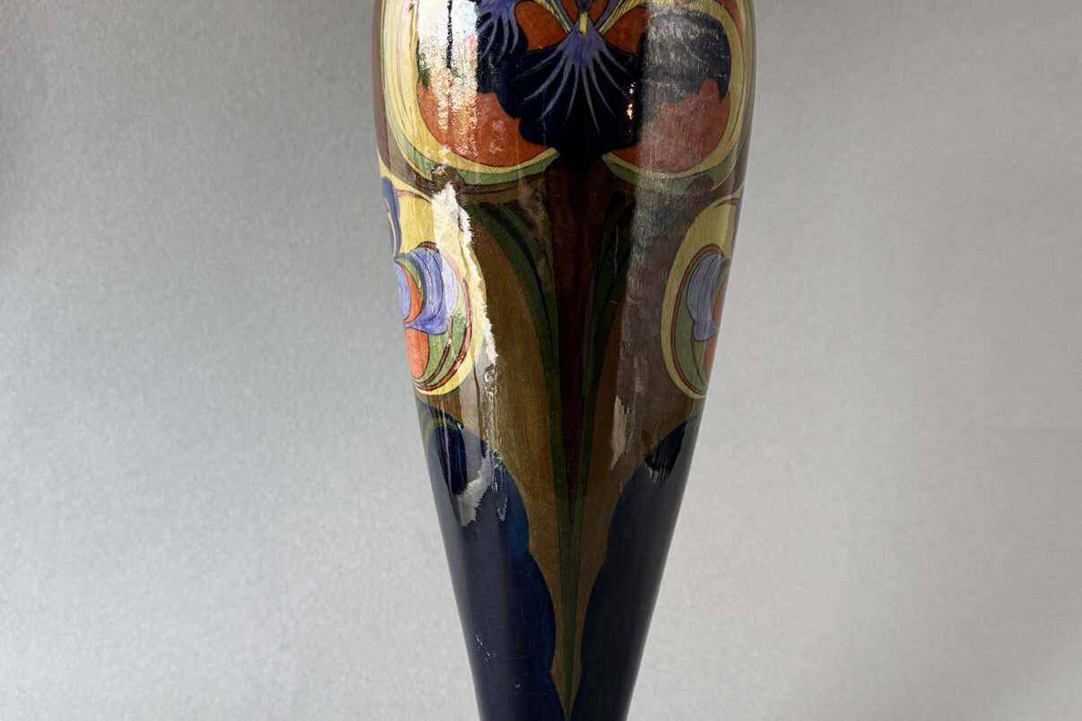 This vase was made by the Dutch pottery firm Jb Vet & Co from the city of Purmerend (near Amsterdam). This factory – founded by brothers Klaas and Jacob Vet – existed only briefly: from 1903 to 1907. This vase must therefore have been made manufactured during this period. The vase is model 112, a very slender vase of 43,2 cm (17 inch) high and 13,5 cm (5.3 inch) wide. The vase has a beautiful polychrome floral decor featuring irises. This decoration is known in Dutch as ‘Bont Floraal’ (Multi-coloured Floral) and is much less common than the decorations consisting of thin blue and yellow lines on a white background (for which Vet became so famous). The vase is clearly marked on the underside. You can see the name: Purmerend and the city’s coat of arms. You can also see a reference to the model and decor number: 112/86. The vase is marked with the signatures of the designer: Jacob Vet (JV) and the pottery painter: Phillipus Lagrand (PL). The vase is in very neat condition. The neck has been restored in the past, which is only visible under UV light. A similar vase (part of the collection of the Municipal Museum in Zwolle) is depicted in the book “Purmerends Jugendstil Aardewerk 1985-1907 – Supplement” on page 124 (see below).