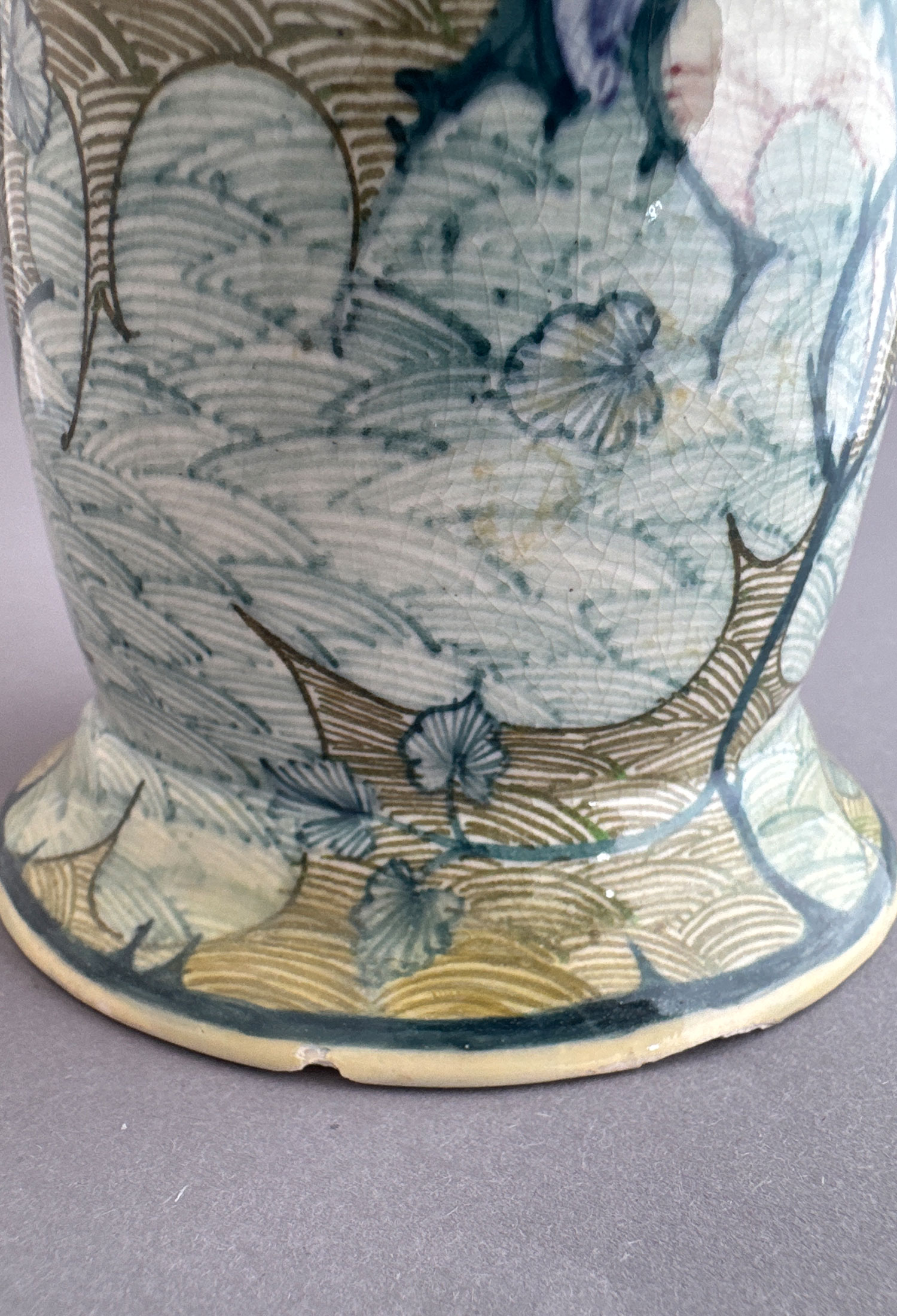 This vase was made by the Dutch pottery company Zuid-Holland from Gouda during the period 1902–1907. It is painted with a P/b decor featuring blue-purple flowers. The artwork on this vase is phenomenal and by the hand of Francien Sanderus. The ‘P’ decor was introduced to the market by the Gouda pottery factory in 1901 to compete with the very popular and expensive eggshell porcelain of competitor Rozenburg from The Hague. ‘P’ decors are characterized by the same stylistic elements, such as the hatched colour areas, which are composed of thin, curved lines. The flowers and leaves also feature these fine lines. The composition of the areas on this slender and tall model, with branches and small leaves, is strikingly beautiful. This is model 332, a very rare model measuring 43 cm (16.9 inch) in height and 11.2 cm (4.4 inch) at the base. The vase has a long neck with several bulges at the neck. The object is clearly signed with the words: Made in Zuid-Holland. On the bottom of the vase, you can also see the Lazarus Gate, the logo of the Gouda pottery factory, a reference to the decor: P/b, and the signature of Francien Sanderus: RS. The sticker on the bottom indicates that the vase is part of the Meentwijck Collection, one of Hollands most renowned Art Nouveau and Art Deco collections.
