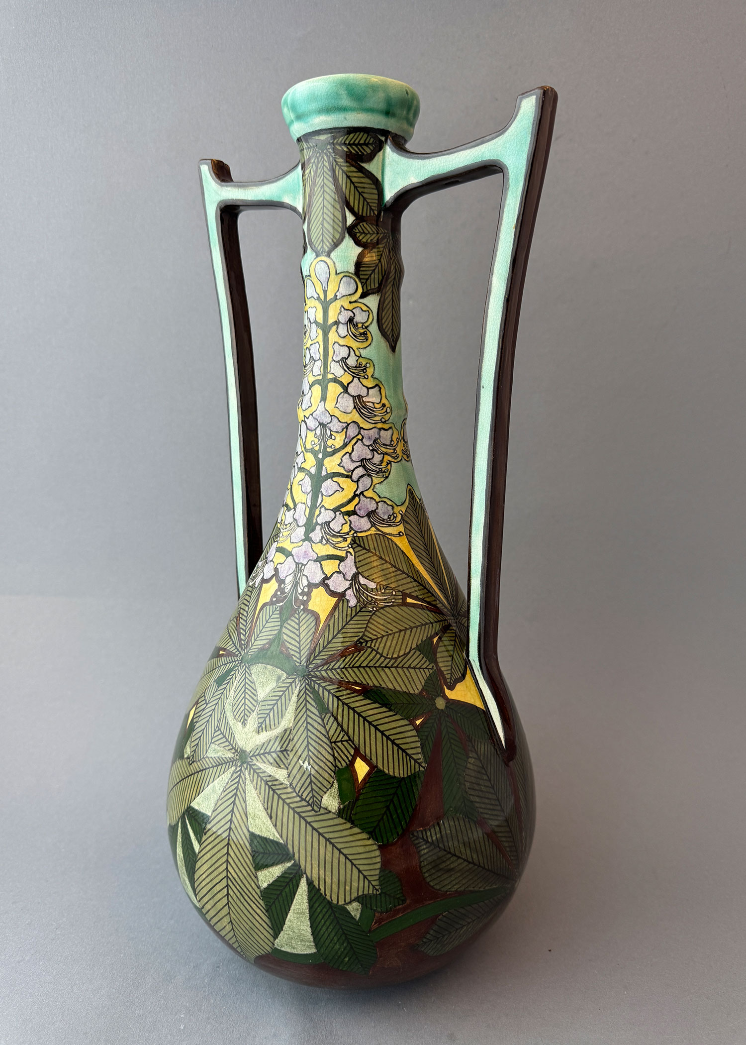 This vase was made by the Dutch pottery firm Wed. N.S.A. Brantjes & Co. from Purmerend in 1898. The vase is tall and narrow, 40 cm (15.7 inch) and 18.5 cm (7.3 inch) respectively. This is model 1055, a bottle-shaped vase with two elegant handles. The vase is painted with pattern B, a pattern featuring chestnut leaves and chestnut blossom, against a dark brown, yellow, and turquoise background. Model 1055 is a well-known model from the Purmerend pottery Brantjes, but you rarely see them with handles. And, importantly, the handles on this object are completely intact. The same applies to the rest of the vase: in perfect condition. The vase is well signed. You can see the name of the factory under the base: Faience de Purmerende Hollande. The clog and the letter NB (for Nicolaas Brantjes), the model number: 1055, the decor code: B, and an additional D, which is probably the date mark for 1898. The signature AP is difficult to read; it is unknown to which pottery painter this signature belongs. This vase used to be part of the Meentwijck Collection a famous Dutch collection of Art Nouveau object’s d’art.