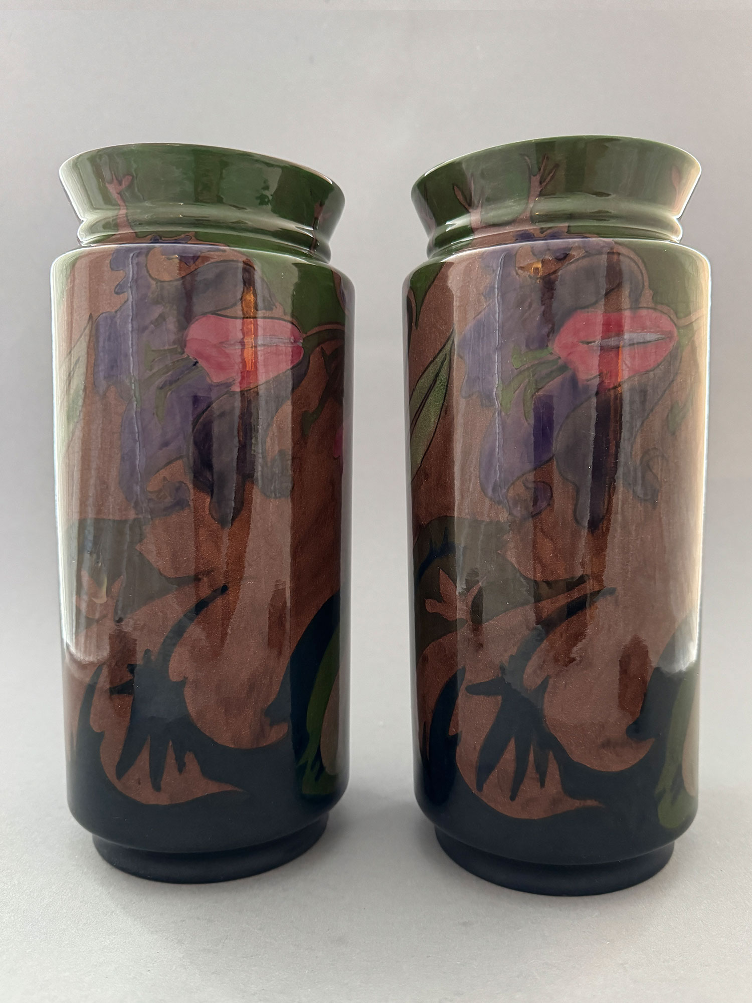 Paar vazen van Gouds plateel, model 72, beschilderd door Leendert Muller