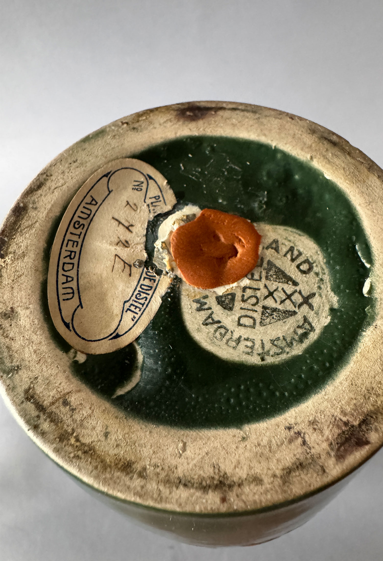 Deze vaas is gemaakt door de Amsterdamse Plateelfabriek De Distel in de periode 1910-1920. De vaas is smal en hoog en meet 40,5 cm (15.9 inch) en 12 cm (4.7 inch) breed. De vaas geeft de vorm van een klassieke amphora met twee kort oren onder de hals. De vaas heeft een donkergroene ondergrond waarop een abstract floraal decor is geschilderd in wit, geel, steenrood en zwart. Het gaat hier om een ontwerp van Bert Nienhuis, die de artistieke leiding had bij de Distel en daar ook het matte plateel ontwikkelde. Mooi zijn de zeer dunne, sierlijke lijnen over de lengte van de vaas. Als je de vaas van zeer dichtbij bekijkt, zie je dat de kleurvlakken allemaal kleine gaatjes hebben, zo is de vaas uit de oven gekomen. De vaas is in een goede staat, echter is er op de bodem van de vaas een gat geboord en weer dichtgemaakt. Vermoedelijk heeft de vaas in de ruime eeuw dat het bestaat ooit dienst gedaan als lampenvoet. Onderop zie je ook de originele sticker van de Distelfabriek, net als de fabrieksstempel.