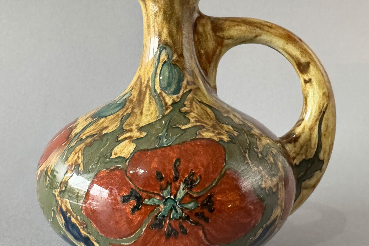 Dit vaasje is gemaakt in oktober 1895 en vervaardigd door de Haagse Plateelfabriek Rozenburg. Dit is model 287A, een kort vaasje met een brede buik en een enkel groot oor. Er is ook een versie (B) met twee oren. Dit vaasje is beschilderd met een klassiek decor van papavers. Je ziet zowel de bloemen, de bladeren als de zaaddozen, tegen een neutrale, lichtbruine achtergrond. Het vaasje is 15,5 cm hoog en 15 cm breed. Onderop is het object goed gemerkt. Je ziet de woorden: Rozenburg Den Haag, de Mx (jaarteken voor 1895) en het werkordernummer: 662. In de werkorderboeken is terug te lezen dat W.F.A. Stolle het vaasje heeft beschilderd. Het object heeft in het verleden een kleine restauratie gehad aan een chip aan de voet. Oor en hals zijn in goede conditie.