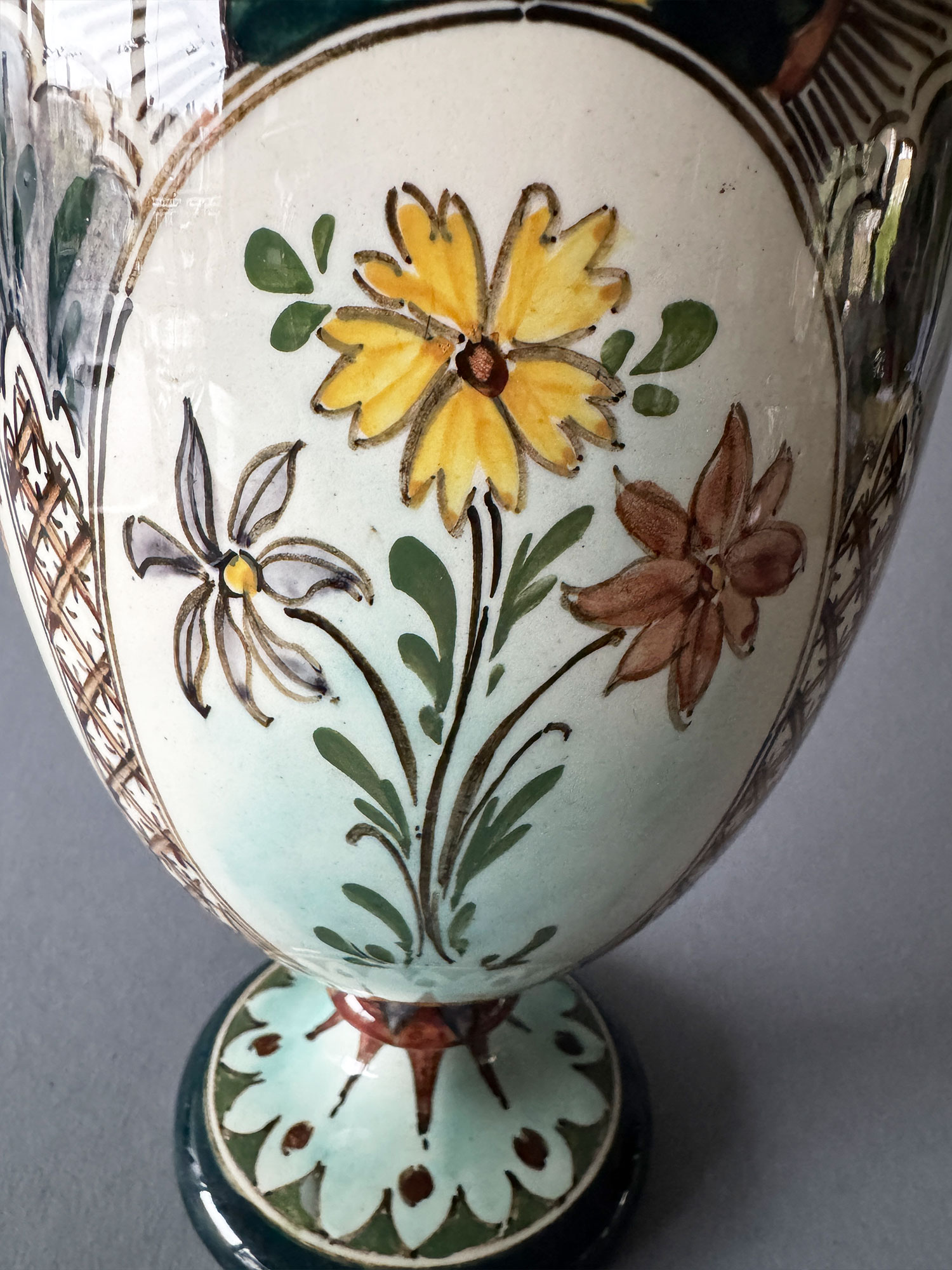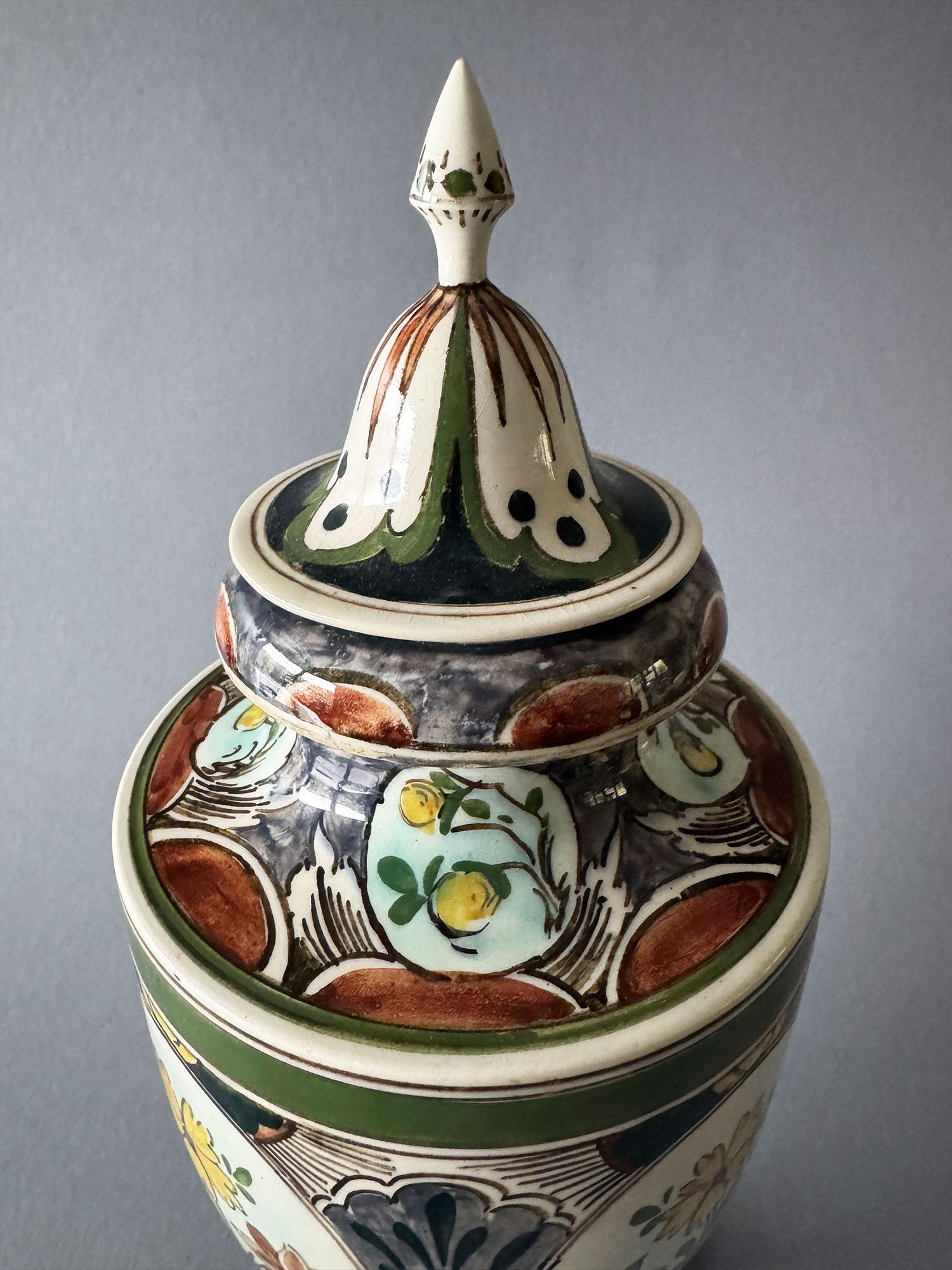 Rozenburg Den Haag, urn-vormige vaas met deksel, model 242 van 30 cm hoog, beschilderd door Willem Hartgring in 1894.