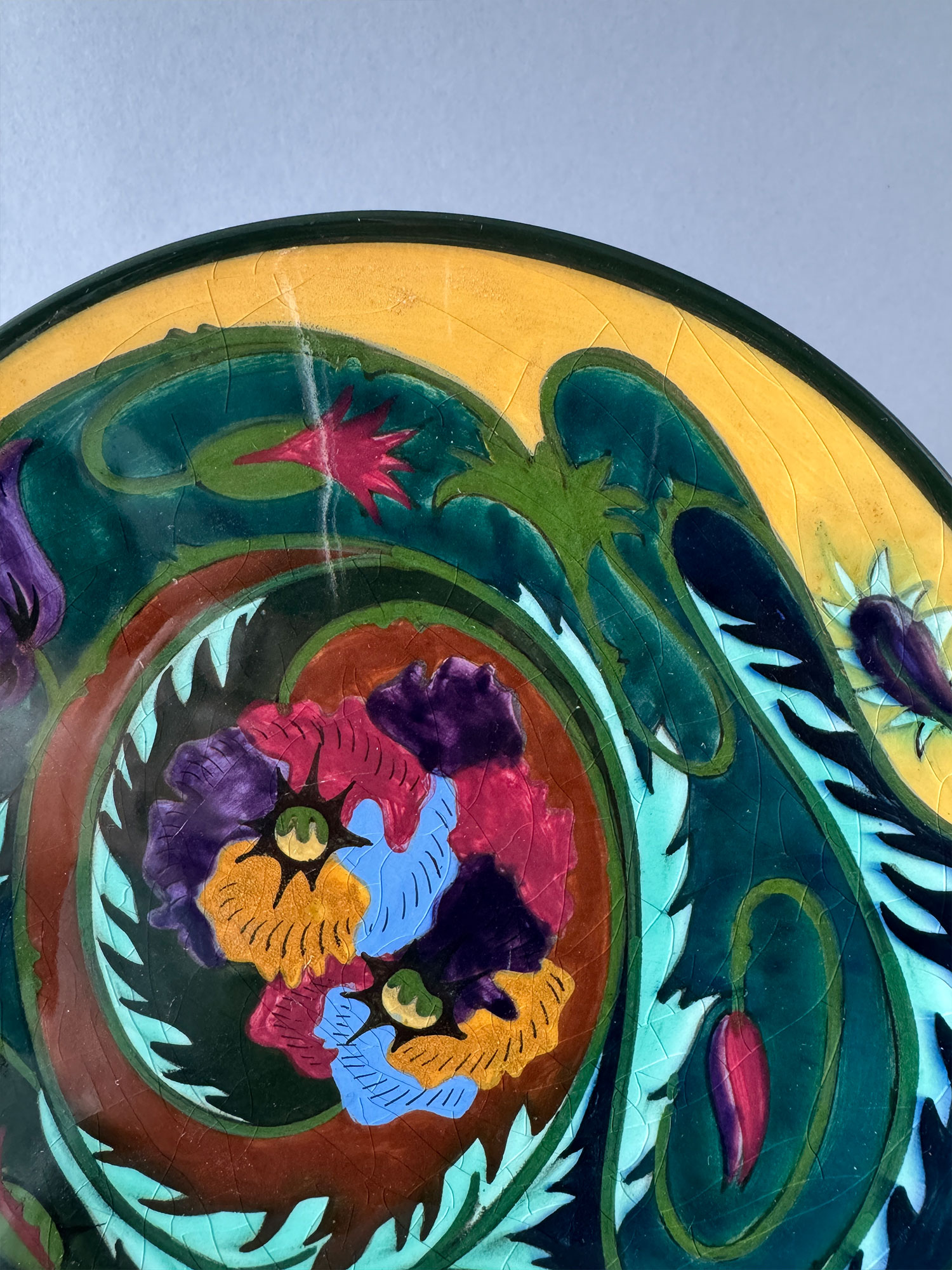 Dit wandbord is gemaakt door Plateelbakkerij Zuid Holland uit Gouda in de periode tussen 1901 en 1907. Het is wandbord model 3 van 22,3 cm doornee. Het bord is beschilderd in een mooi Gouda-decor met viooltjes in een geweldige kleurstelling met paarse bloemen, met turquoise, zwarte, groene en knalgele kleurvlakken in de achtergrond. Het bord is goed gemerkt. Je ziet de woorden: Made in Zuid-Holland, het fabriekslogo (Lazaruspoortje) en de signatuur van Lambertus Kwinkelenberg: LK. Het bord is gaaf.
